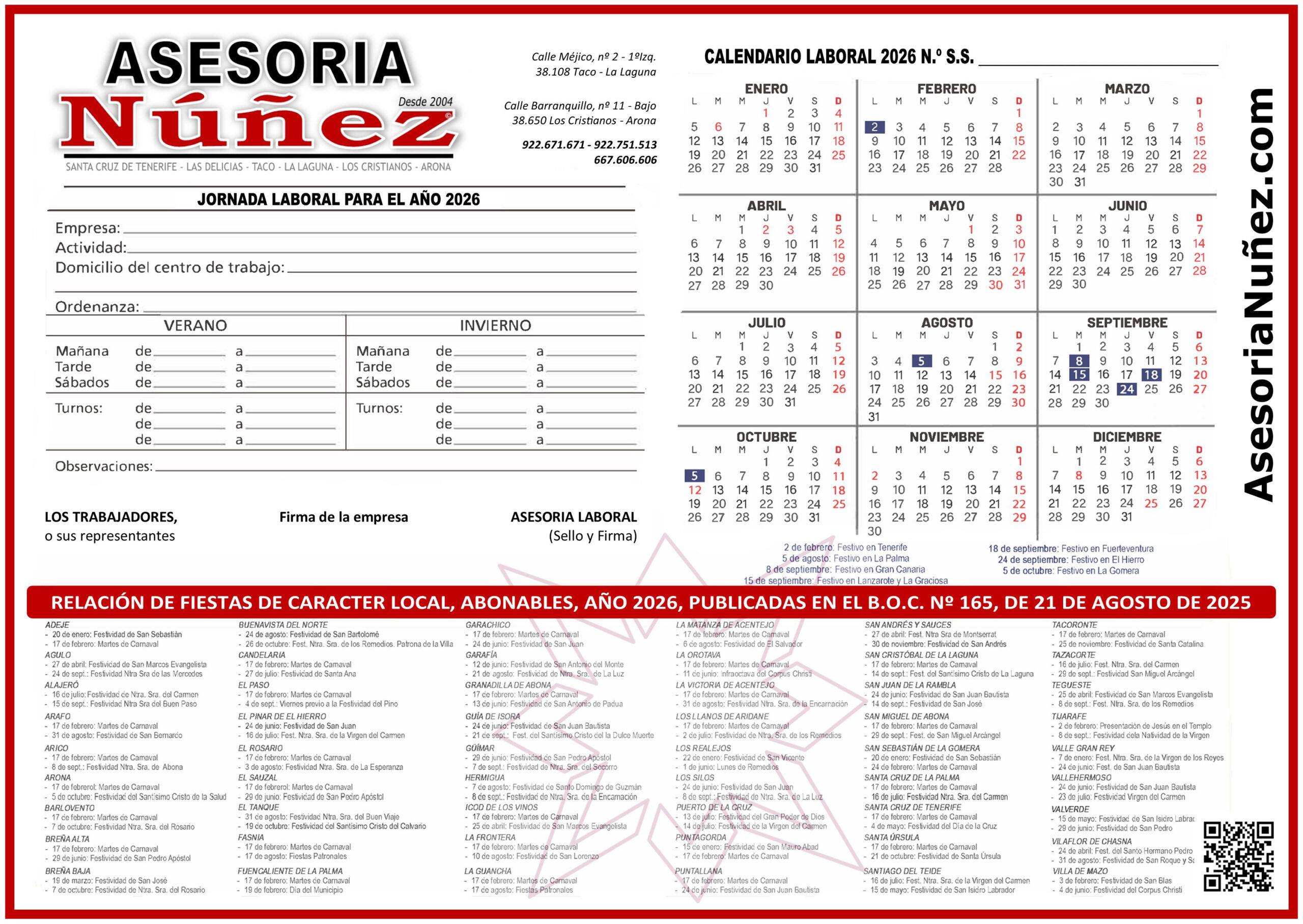 Calendario laboral Tenerife 2026 Asesoría Núñez Agencia Tributaria, Autónomo, Noticias La Asesoría Núñez pone a su disposición el calendario laboral de la Isla de Tenerife año 2026 en dos formatos diferentes: Descargar Descargar calendario, calendario laboral 30 diciembre, 2025